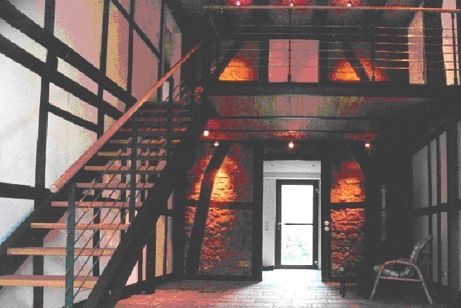 Entwurf: Wohndeele mit offenem Fachwerk zum Seitenteil l zeitgemäße Stahl-Holztreppe l Bad mit freigelegten Natursteingefachen